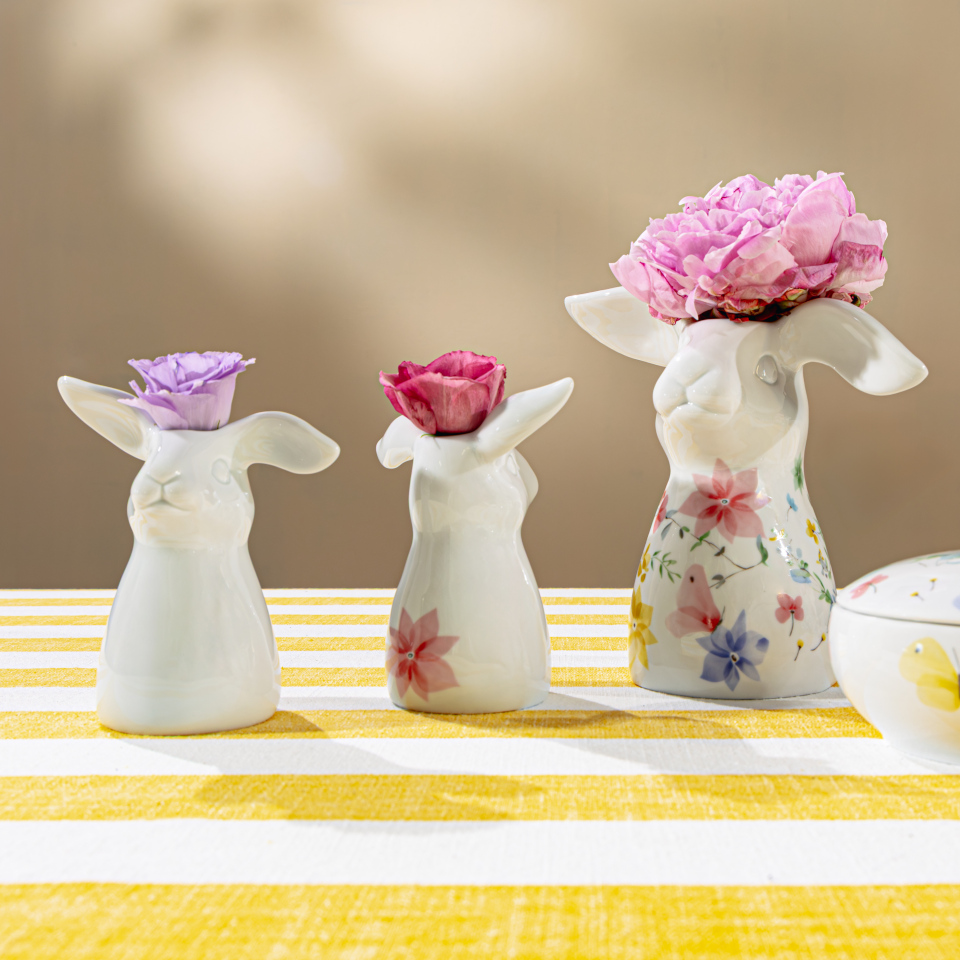 Les adorables vases lapins sont disponibles en deux tailles : 11 cm et 16 cm. Les nouveaux vases aux longues oreilles sont ornés d'une délicate décoration représentant une prairie fleurie, des fleurs et des papillons dans des tons pastel doux. Si vous en voulez encore plus, vous pouvez acheter des bols, des coquetiers et des figurines assortis dans la collection Salutations printanières.