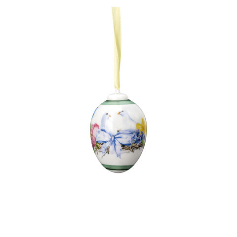 Hutschenreuther Maxi Dose aus Porzellan in Ei-Form mit Porzellan-Eier-Anhängern und Blumen im Vordergrund
